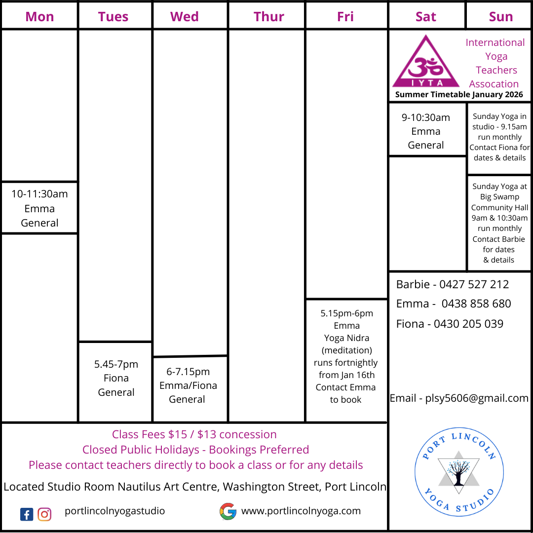 Port Lincoln School of Yoga is closed public holidays.
